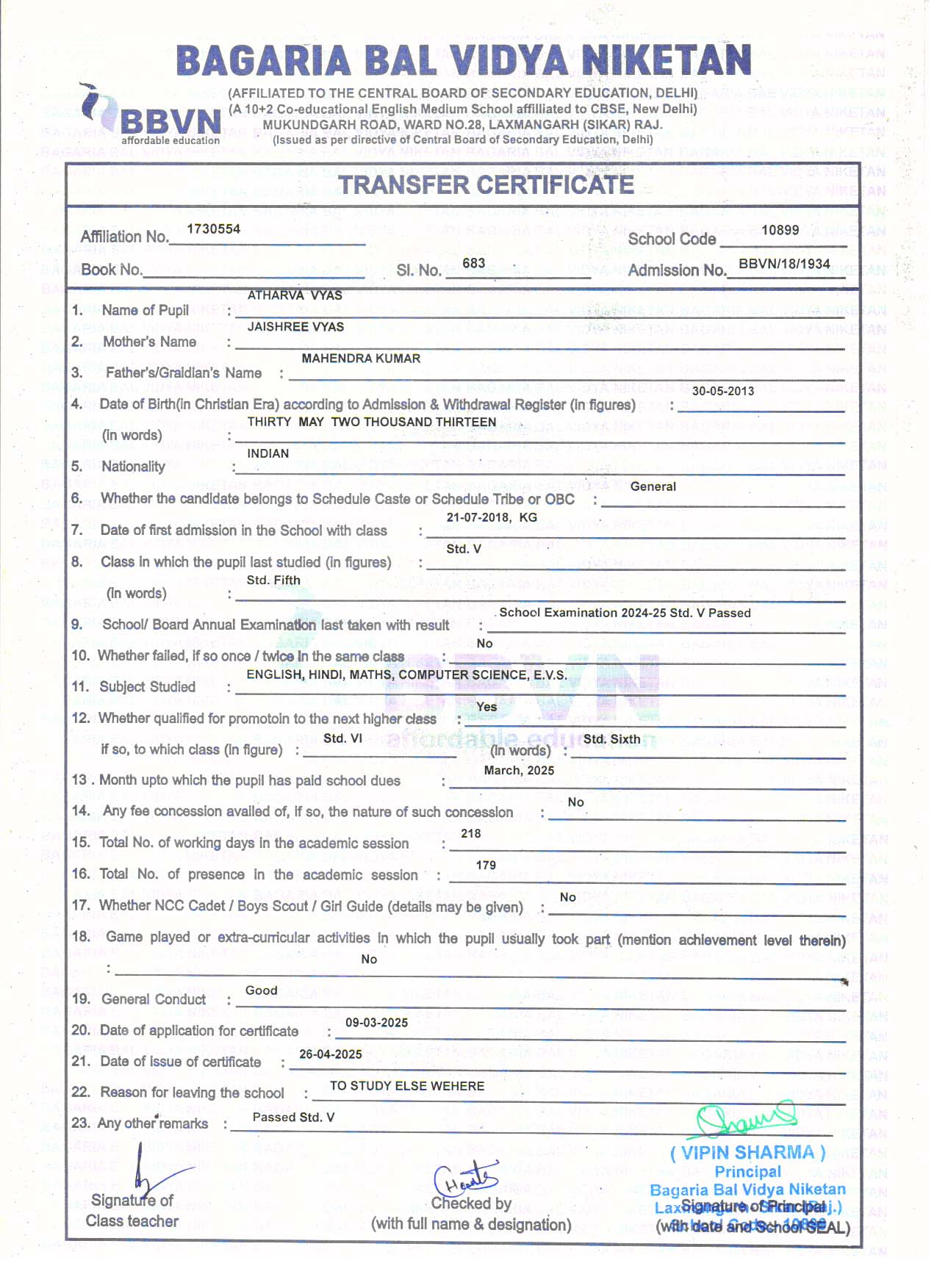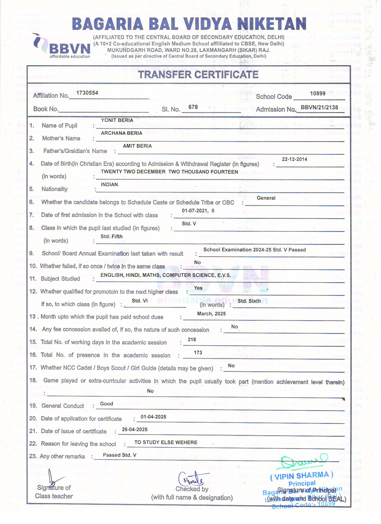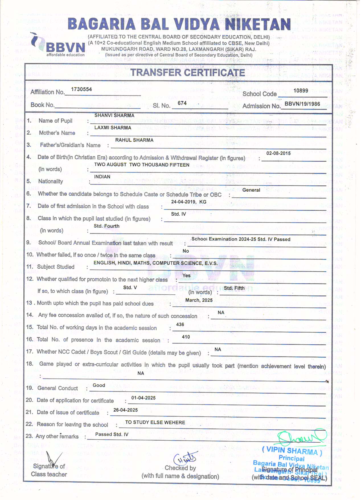 | 5 | SHANVI SHARMA | RAHUL SHARMA | V | Download |