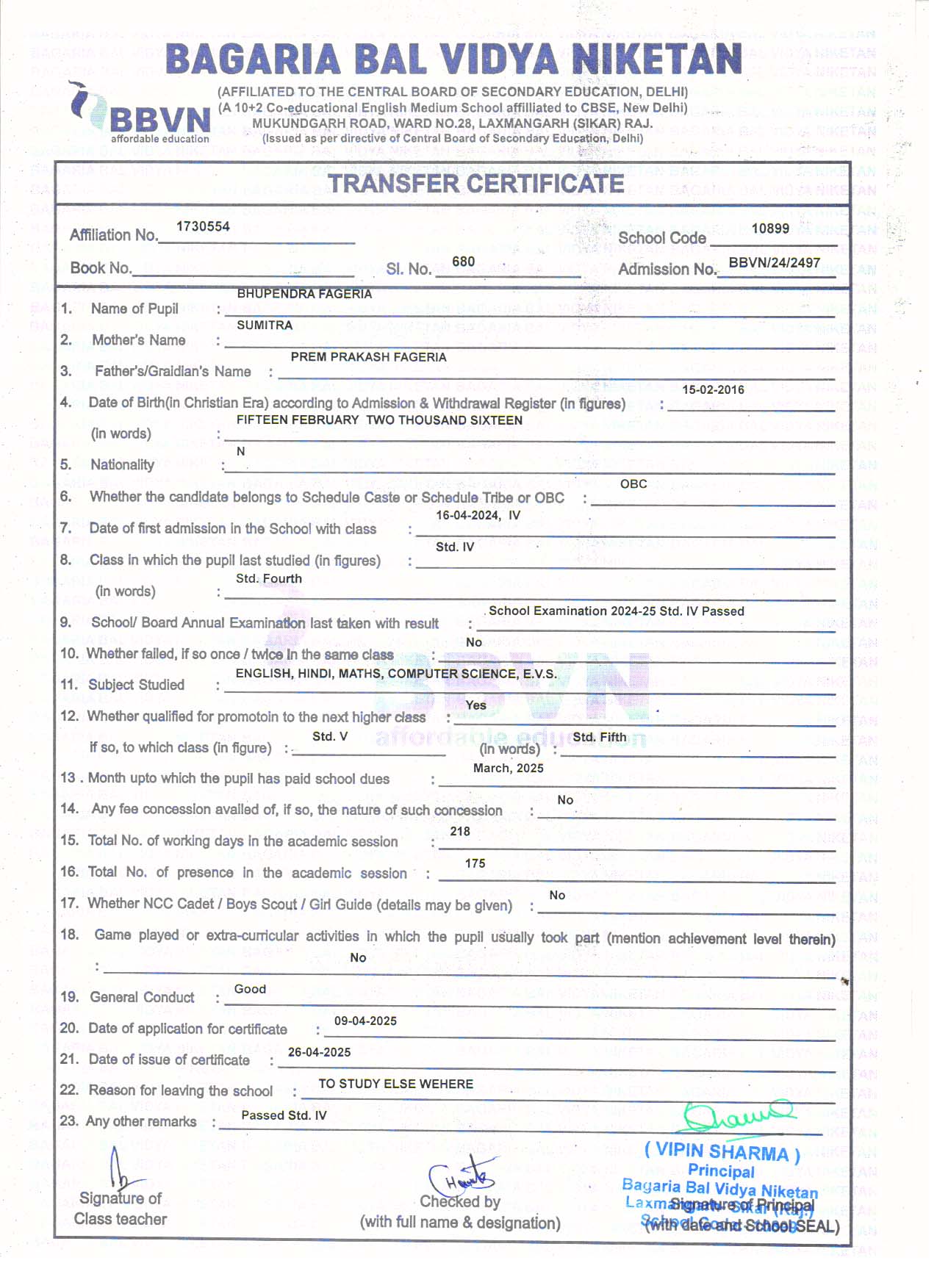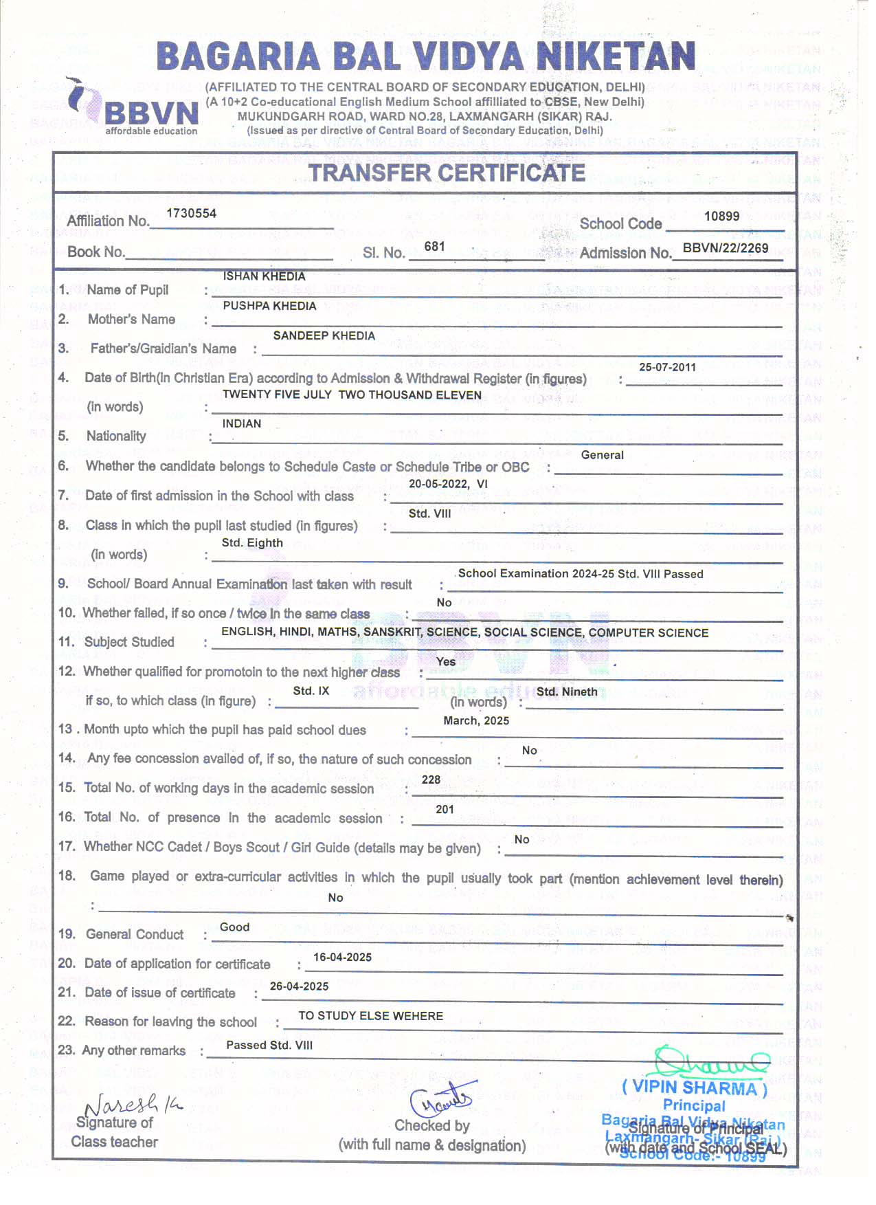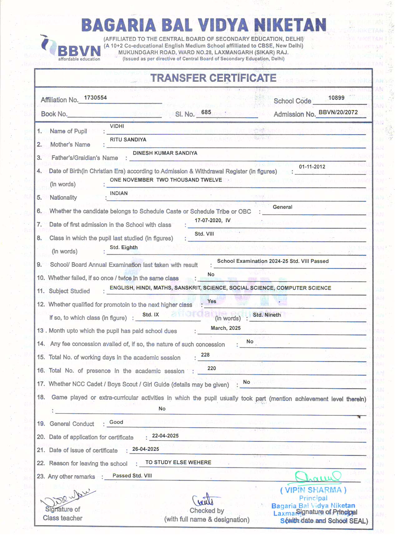 | 5 | SHANVI SHARMA | RAHUL SHARMA | V | Download |