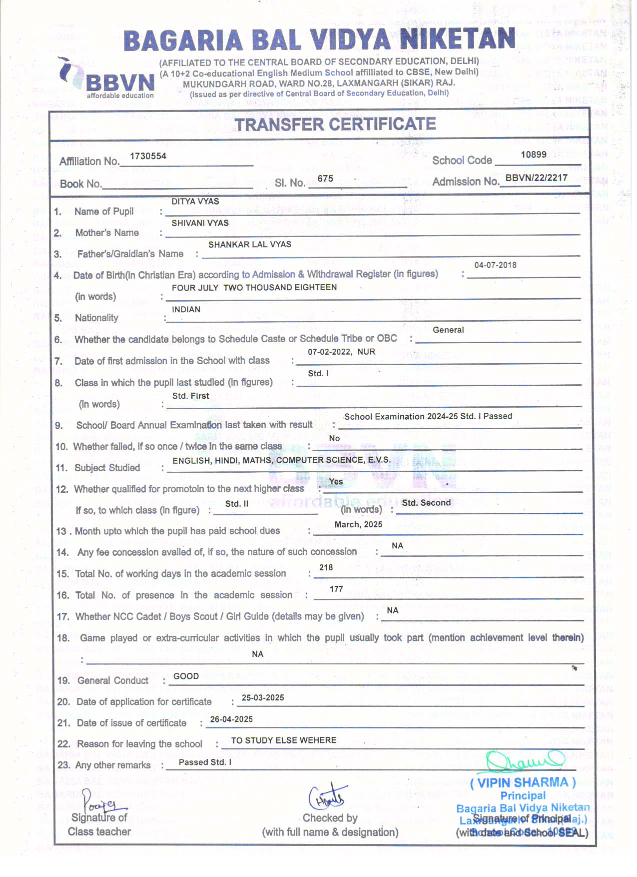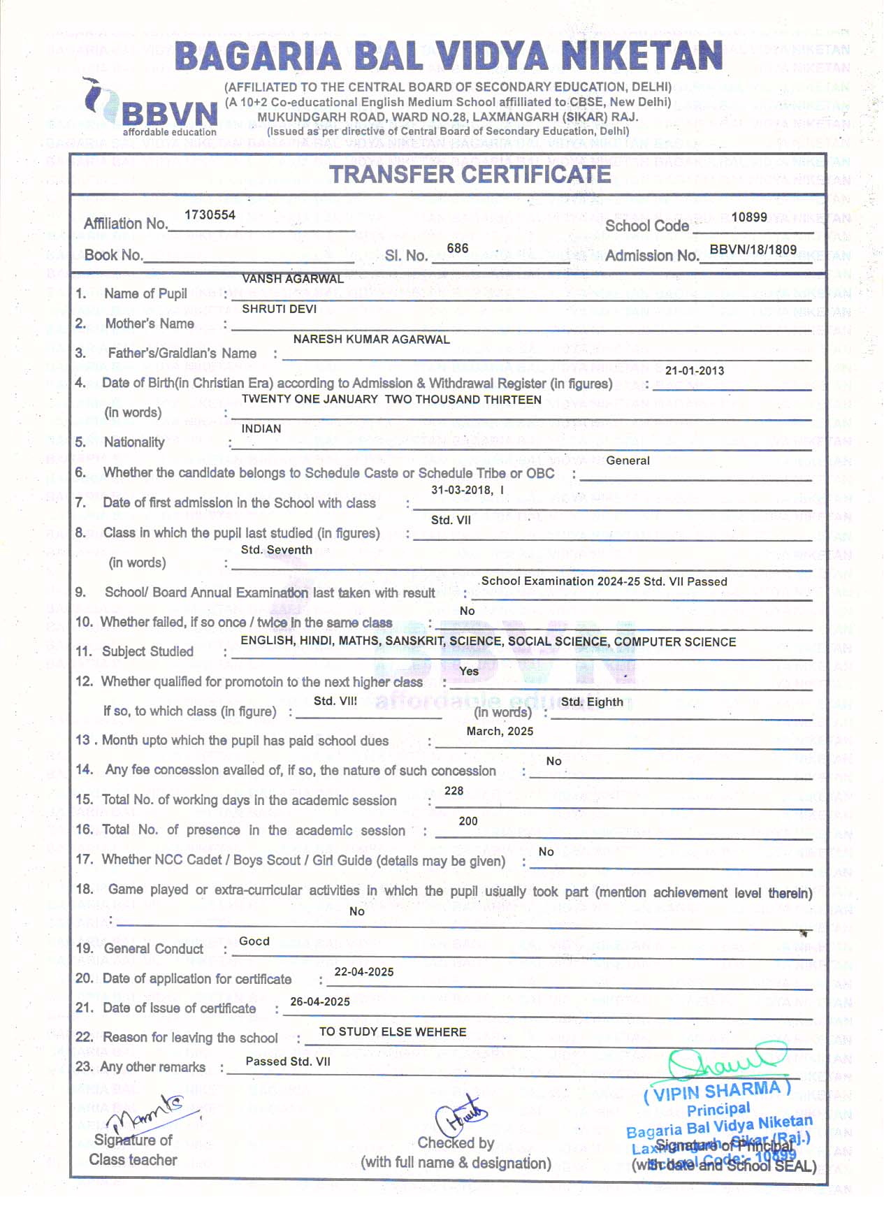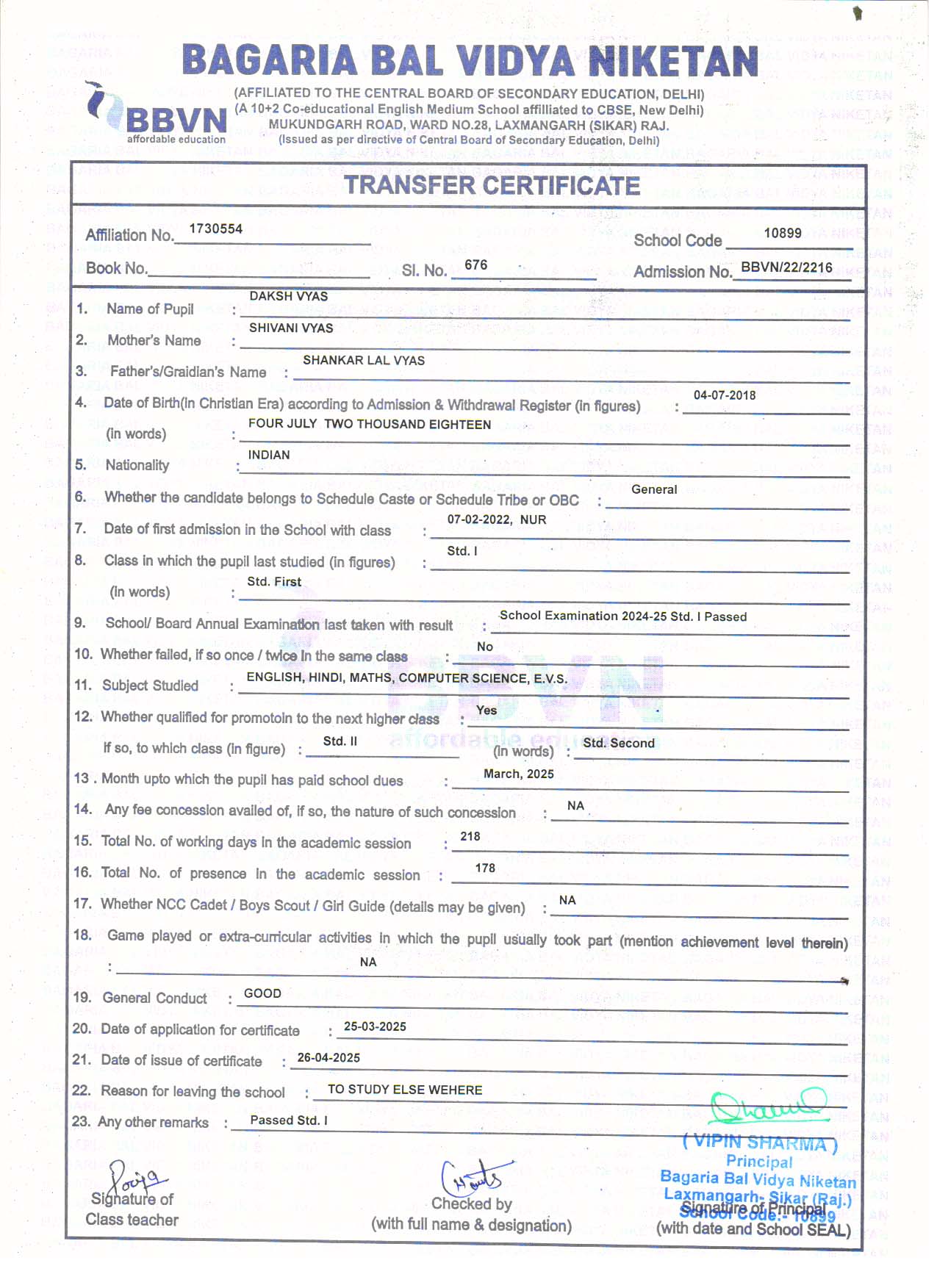 | 2 | DAKSH VYAS | SHANKAR LAL VYAS | II | Download |