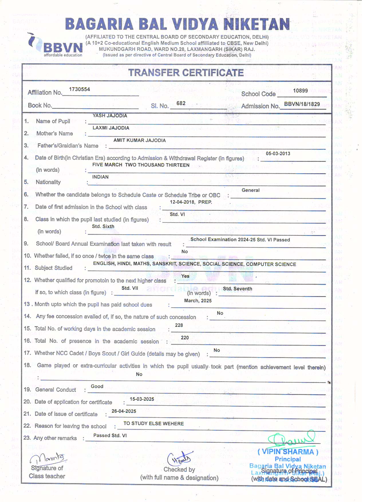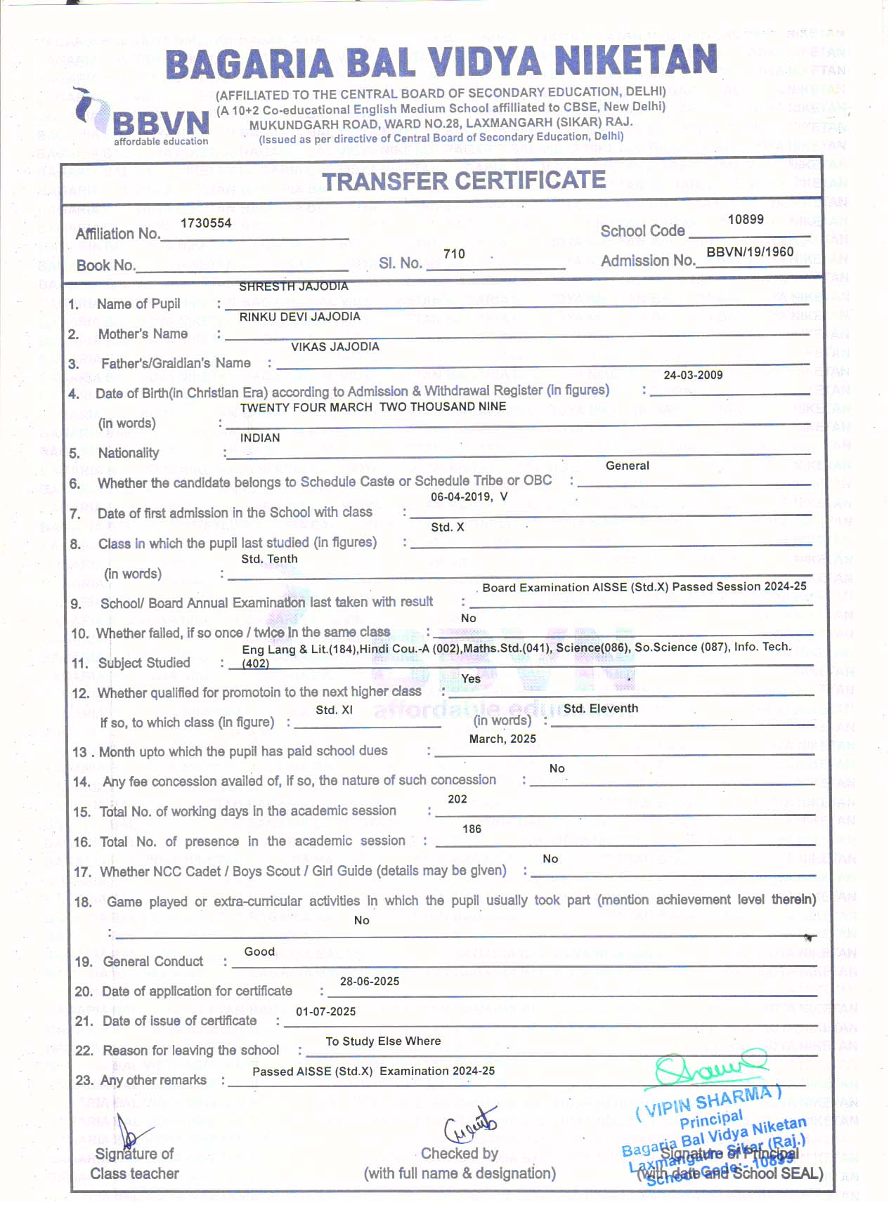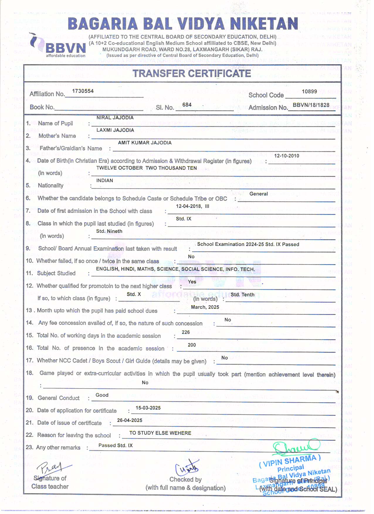 | 9 | YASH JAJODIA | AMIT KUMAR JAJODIA | VII | Download |