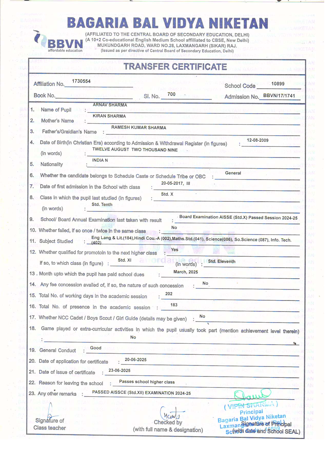 | 16 | ARNAV SHARMA | RAMESH KUMAR SHARMA | XI | Download |